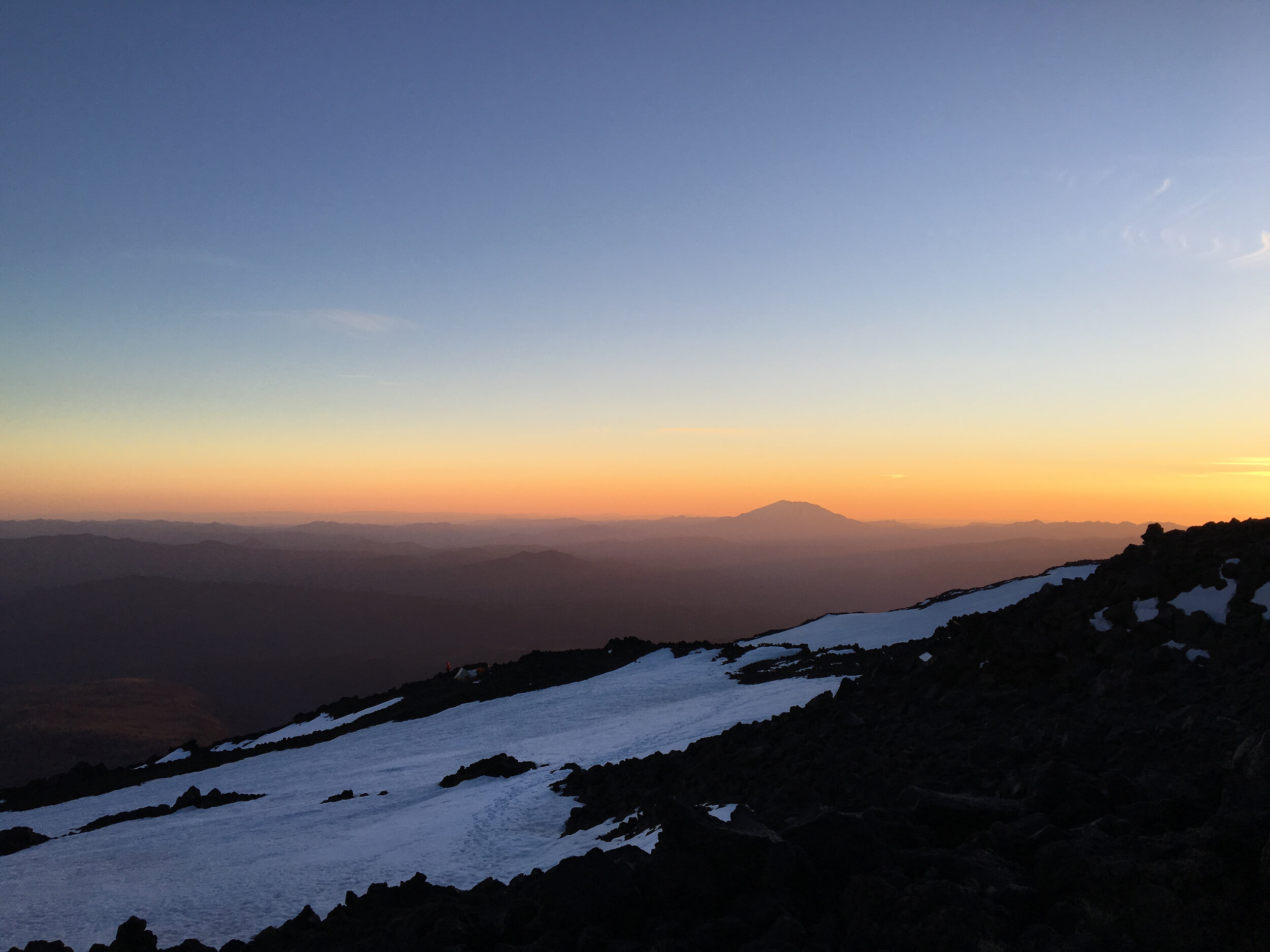 We made it to Lunch Counter and were able to quickly set up camp as the sun began to set on Sunday evening. From here, we were able to see an amazing view of Mt. Hood, St. Helens, and the false summit of Mount Adams called Pikers Peak.